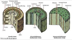 ส่วนใหญ่ไม่มีแคมเบียม จึงไม่มีการเจริญขั้นที่ 2 การเรียงตัวของท่อลำเลียงกระจัดกระจายไม่เป็นระเบียบ